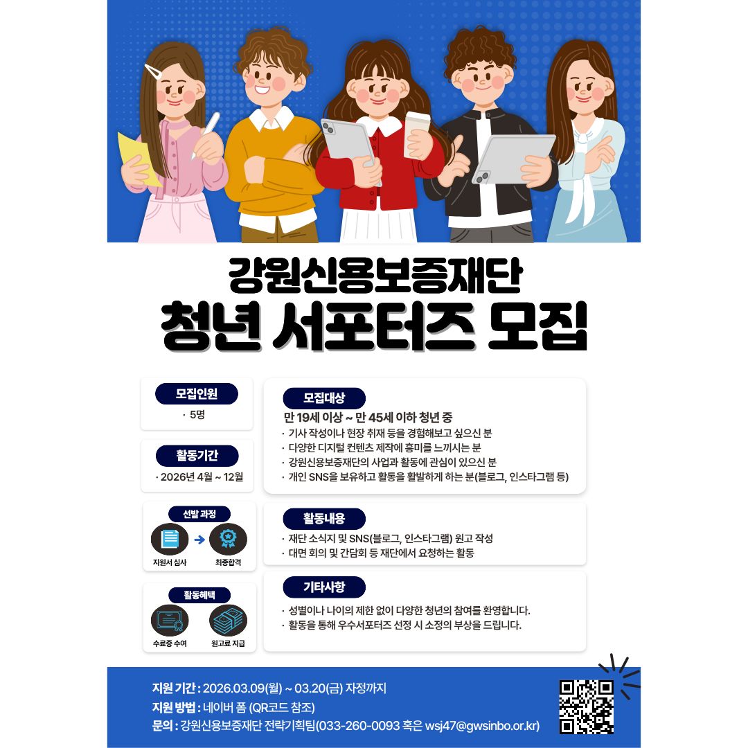 <개요> · 모집인원: 5명 이내 · 모집기간: 2026. 3. 9.(월) ~ 3. 20.(금) · 활동기간: 2026. 4월 ~ 12월 <모집대상> · 만19세 ~ 만45세 이하 청년 · 기사 작성이나 현장 취재 등을 경험해보고 싶으신 분 · 다양한 디지털 컨텐츠 제작에 흥미를 느끼시는 분 · 강원신용보증재단의 사업과 활동에 관심이 있으신 분 · 개인 SNS을 보유하고 활동을 활발하게 하는 분(블로그, 인스타그램 등) <수행내용> · 재단 소식지 및 SNS(블로그, 인스타그램) 원고 작성 · 대면 회의 및 간담회 등 재단에서 요청하는 활동 <기타사항> · 성별이나 나이의 제한 없이 다양한 청년의 참여를 환영합니다. · 활동을 통해 우수서포터즈 선정 시 소정의 부상을 드립니다. · 선발과정은 서류심사 단일전형이며 수료시 재단 명의의 수료증을 드립니다. · 원고 작성시 원고료 지급 · 회의 및 세미나는 춘천지역에서 진행(참석률 저조시 미수료 처리될 수 있음.) <지원방법> · 포스터의 QR코드 인식을 통해 네이버 폼(https://naver.me/5l2yVIeU) 을 작성 · 재단 내부 서류심사를 통해 3/25까지 심사결과 개별 연락드립니다. 블로그: https://blog.naver.com/gwsinbo |